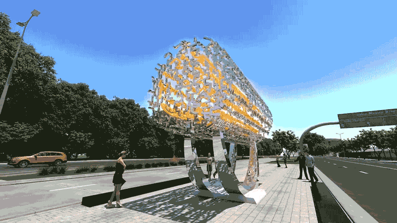 In the daytime, the sculpture will sparkle with natural sunlight, and at night, the gold interior cylinder is illuminated by LED lights. The experience for each viewer will be unique and change upon every visit as the artwork is not separate from its environment.